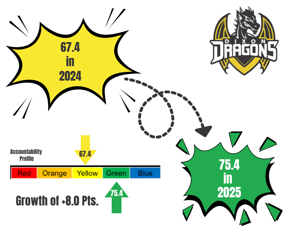 🔥 Dixon Dragons are Fired Up! 🔥 State assessment and accountability scores were released today, and Dixon Elementary climbed from 67.4 to 75.4, gaining 8 full points this year! Dixon Elementary is...